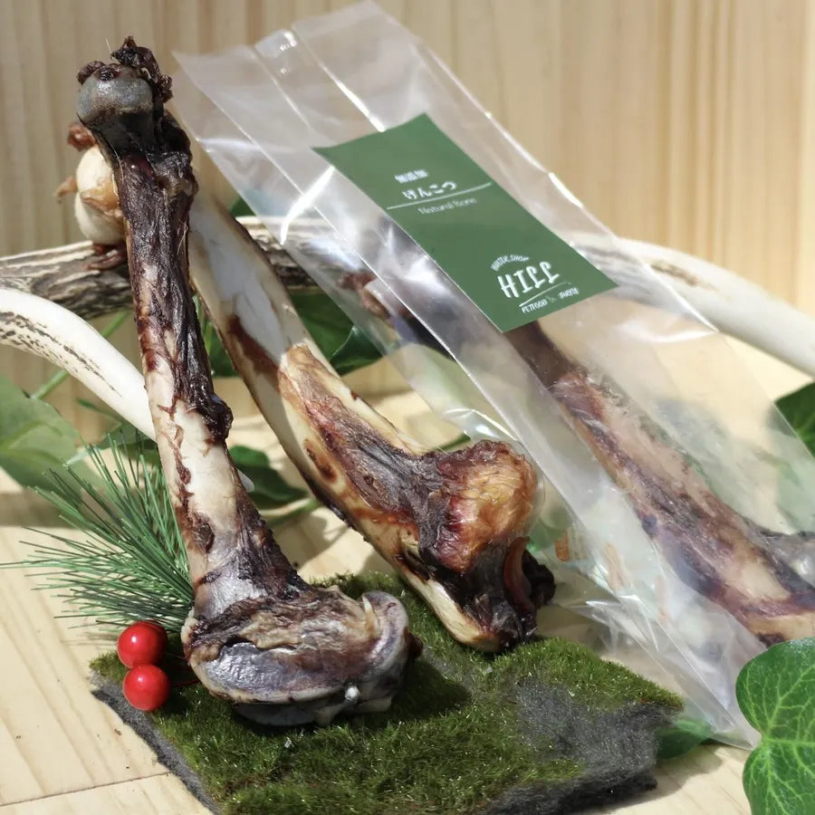 低脂質・低アレルゲンかつカルシウム豊富で長持ちする鹿大腿骨を、高温で長時間乾燥させた完全無添加鹿骨ジャーキー。